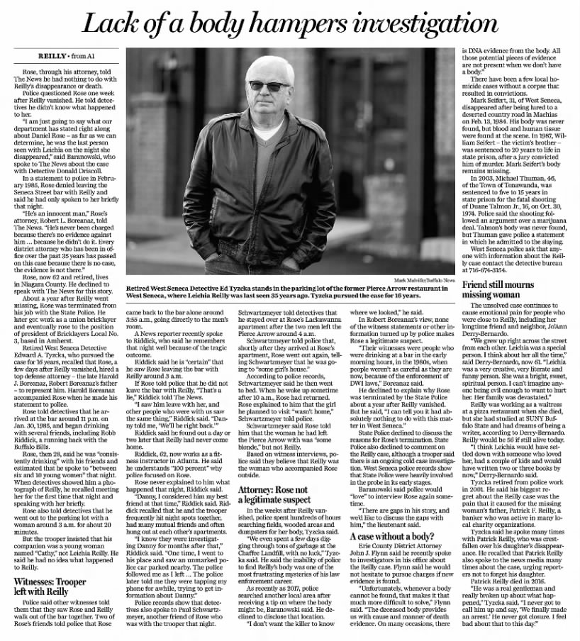 The day after Reilly disappeared Rose called into work sick; when questioned by investigators about what he did that day he refused to answer. After the state police were notified of Reilly’s disappearance he was taken off road patrol and was put on desk duty ‘pending further investigation.’ Retired West Seneca Detective Edward A. Tyzcka worked on Reilly’s case for sixteen years, and he pointed out that just a few days after she vanished Rose hired a top defense attorney (the late Harold J. Boreanaz) to represent him and brought the lawyer with him to his interview. ‘That would make you think, well, here’s a guy who could help us. He saw the person we were looking for, why would he not help us?’ … ‘Once he got represented by a lawyer, that put a kibosh on anything we could do.’ Investigators from West Seneca waited two weeks after Reilly disappeared to speak with Rose, and on February 14, 1985 he told investigators that on the evening she disappeared he had been out drinking with buddies and he spoke to several women, including Reilly. During the interview Rose shared he was ‘consistently drinking’ and estimated that he spoke to ‘between six and 10 young women’ that evening. When investigators showed him a picture of Reilly, he said he met her for the first time that night but only spoke with her briefly. He also said that at about 3:00 AM he went out to the parking lot with a young woman named Cathy for about twenty minutes, and specified that it wasn’t with Reilly. Rose told detectives that he didn’t know what happened to Leichia or who she even was, and after giving his initial statement he refused to speak to them again and cooperate any further.