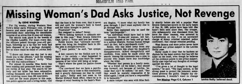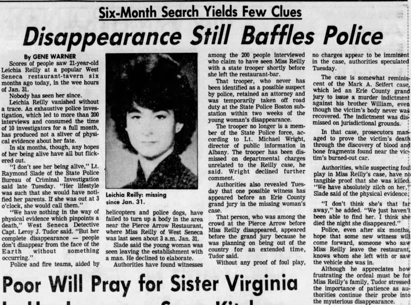 In March 1985 retired Erie County DA Richard Arkara announced that authorities would be offering a ten thousand dollar reward for information leading to the discovery of the missing woman or the arrest of her suspected killer. Unfortunately, this offer didn’t really go anywhere nor did it seem to encourage anyone that may have been privy to any information about Reilly’s disappearance to come forward. The investigation continued, however without anything substantial coming in there was little detectives could do to advance it and quickly Leichia Reilly faded from the headlines. Days turned to weeks, weeks to months, and months to years… and the case eventually went cold.