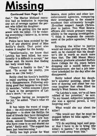 Mr. Reilly spoke very highly of the West Seneca police regarding all of their hard work and dedication in trying to solve his daughters case. Although the Reilly’s mostly preferred to stay out of the limelight, Patrick stepped up as the family’s public representative and when asked about Leichia’s disappearance said: ‘I want justice, not sympathy. I’m convinced that we have a psychotic killer who is loose in this community and it greatly distresses me that he could kill again. I know what my family has gone through, I don’t want anybody else to go through that.’ He went on to say that his family had been incapable of enjoying anything since Leichia disappeared, and: ‘intellectually, we know that Leichia has been killed, but emotionally it’s difficult to accept imagine having an incapacity for joy that’s what we have in Leichia’s case. We’ve all been robbed of her potential, in my biased subjective judgment. She was a special person, a very forgiving soul.’ Mr. Reilly also told the media that he felt all of the evidence pointed towards one individual and he hoped that anyone that had any information regarding what may have happened to his daughter would come forward and end the horrifying situation his family found themselves in.