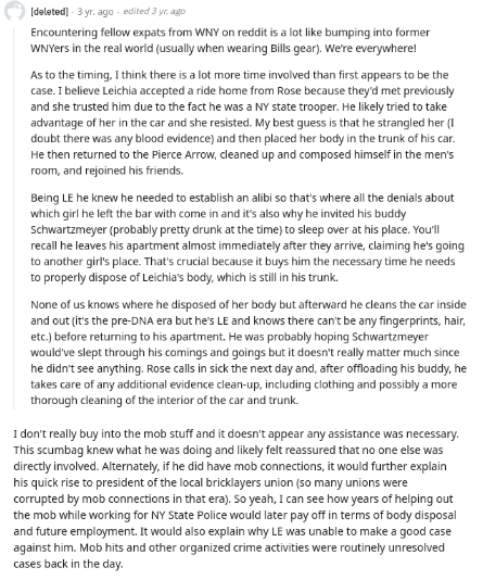 To me, the fact that Rose was a lifelong resident of NYS and patrolled the area for his employment suggests that he was pretty familiar with the area, and would have most likely known plenty of places where he could have disposed of a dead body. I would think he was also at the very least fairly well-versed in the law as well: I know that in 2024 to be a Trooper in New York state you ‘must have completed 60 college credit hours at an accredited college or university’ and had to take a civil service exam as well.