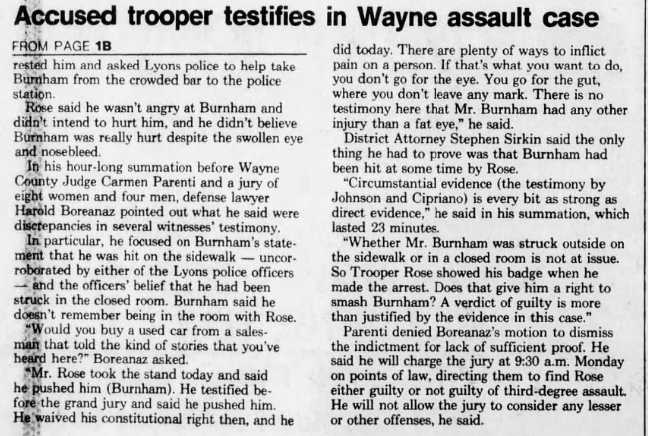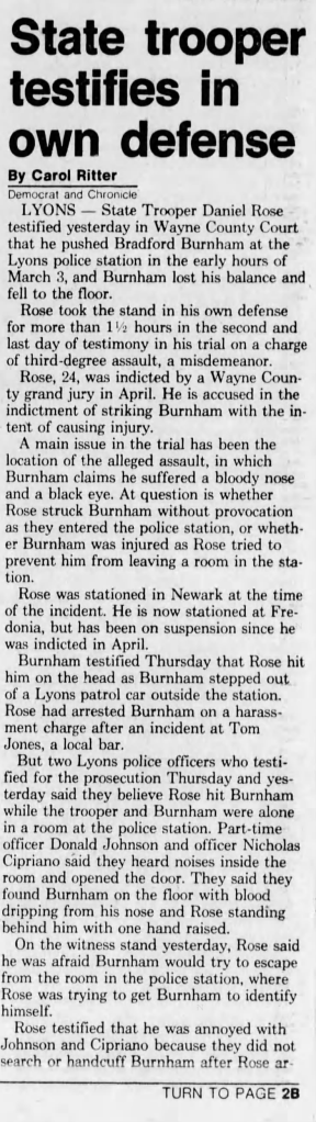 Even when he was employed with the NYS Troopers Daniel Rose had problems behaving himself and being a law-abiding citizen: in April 1982 he stood trial after being charged with third degree assault after getting into an altercation with Bradford Burnham at a Lyons Police station after he arrested him at a nearby bar. Apparently Rose and a girlfriend met another trooper and his wife out at The Tom Jones club for a night of drinking, and he was off duty at the time of the altercation. Reportedly nineteen-year-old Burnham was making ‘obscene references to the Newark Police Department, and a shouting match ensued.’ He was arrested by Rose for harassment and resisting arrest and was taken to the local police substation for booking. Burnham said that the officer ‘hit him on the head without provocation as he stepped out of a patrol car near the Lyons police station.’ Additionally, while at the station Lyons LE left the trooper alone with the suspect, and after hearing a scuffle they returned and found him on the floor with blood on his face: Rose had struck him in the head. After reviewing the case, the grand jury dismissed the original charges against Burnham and instead returned an indictment against Daniel Rose. When the case was brought to trial a verdict was made after a Wayne County Jury deliberated for only two hours: he was found not guilty. It was a unanimous decision and Rose was able to keep his job as a NYS Trooper.