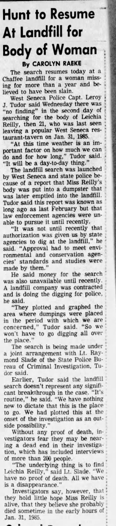 Convinced that Reilly was dead, investigators spent thousands of combined man hours looking for her body, using everything from cadaver dogs to helicopters to aid in their efforts. Beginning on February 4, 1986 and ending on the 26th (in an attempt to be completely accurate, I’ve seen it reported as taking place from the 5th to the 27th), investigators dug through the Chaffee Landfill (located at 10860 Olean Road) during a brutal winter storm after receiving a tip that her body had been disposed of there in a dumpster. The search resulted in nothing.