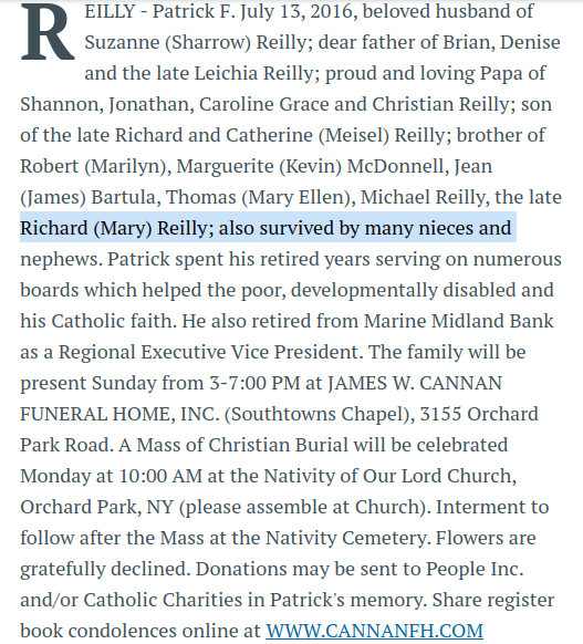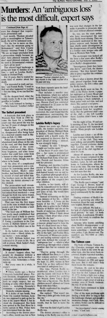 It’s worth noting, in recent years there have been a couple of local homicide convictions in WNY that were made without a body: on February 13, 1984 thirty-one year old Mark Seifert of West Seneca disappeared after being lured to a deserted country road in Machias. Although his body was never recovered, blood and tissue was found at the scene and in 1987 his brother William was sentenced to 20 years to life in prison after a jury convicted him of murder. To this day Seifert’s body has never been recovered. In 2003 46 year old Town of Tonawanda resident Michael Thuman was sentenced to five to fifteen years in prison for the shooting death of sixteen year old Duane Talmon Jr. on October 30, 1974. Investigators said the murder took place after a marijuana deal went bad, and although Talmon’s body was never recovered Thuman gave police a statement in which he admitted to the slaying. Erie County DA John J. Flynn said he recently spoke to investigators in his department regarding Reilly’s disappearance, and he said that he would not hesitate to pursue charges if new evidence was ever uncovered, but ‘unfortunately, whenever a body cannot be found, that makes it that much more difficult to solve. The deceased body provides us with cause and manner of death evidence. On many occasions, there is DNA evidence from the body. All those potential pieces of evidence are not present when we don’t have a body.’