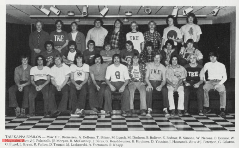 Bill Hagmaier in a group picture from an academic fraternity from his time at Slippery Rock University in 1969.