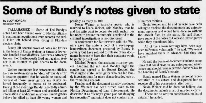 Diana first met Ted Bundy in October 1986 through psychologist Art Norman, who was brought on earlier in the year to interview him for a clemency proceeding. Dr. Norman was in the same social circle as Weiner and her husband, and he felt that Bundy would be more open and honest if there was an ‘intelligent, attractive attorney, and a woman who could be very open and would have the personality to open up and would not be threatened by whatever he says.’ Well, he was definitely on the right track: almost immediately, Diana’s presence prompted Ted to talk more honestly and intensely about his feelings towards violence and women, which were ‘things he has difficulty talking about with a man.’ All of this was being done by Dr. Norman in an attempt to figure out whether the killer had been ‘mentally competent’ to stand trial when he was convicted in the early 1980’s. Shortly after their meeting, Weiner officially became Bundy’s civil attorney and represented him (along with other death row inmates) in a civil rights lawsuit surrounding the poor ‘exercise conditions’ at Raiford Prison.