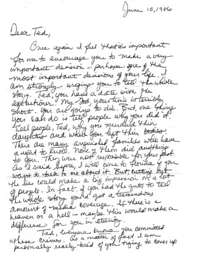 The transcribed letter Cowell sent Bundy on June 10, 1986. In it, she once again pleaded with him to give closure to his victims’ families.