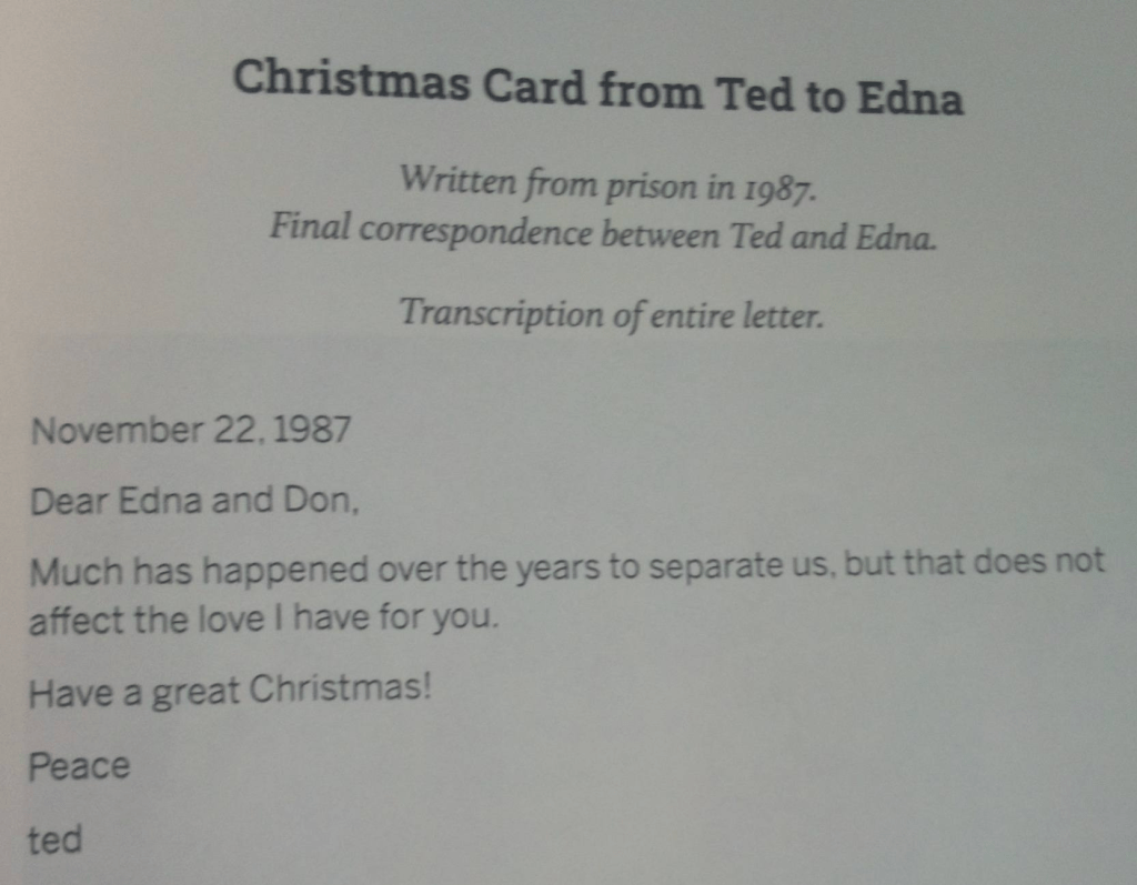 In part one of a transcribed letter from May 31, 1986, Edna expressed to Ted how she was remorseful over how she missed her cousin’s murderous rage, admitting that she ‘saw only one side of you.’
