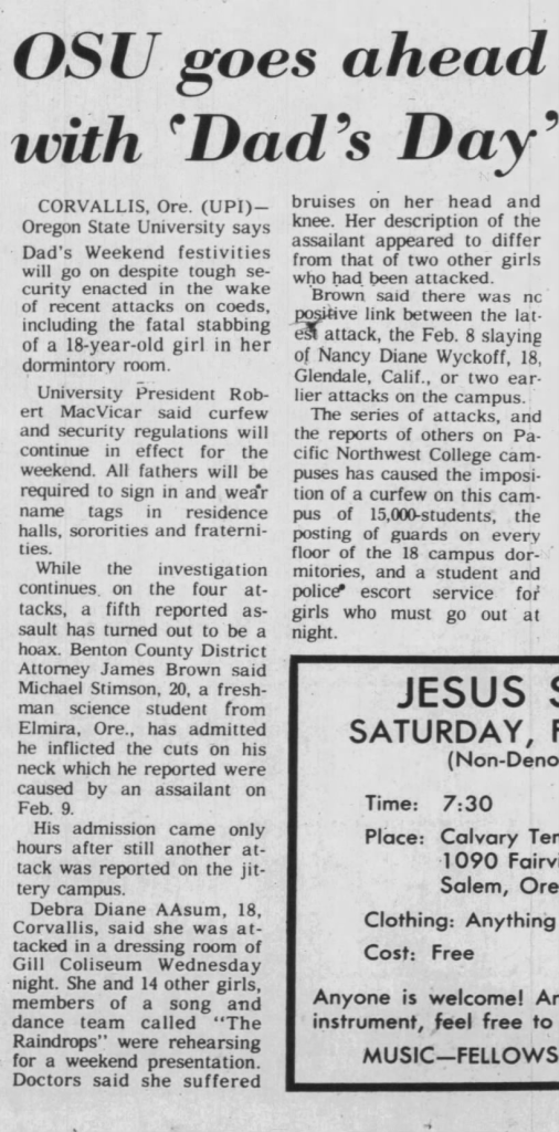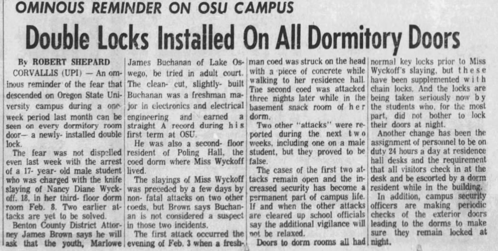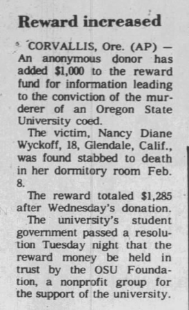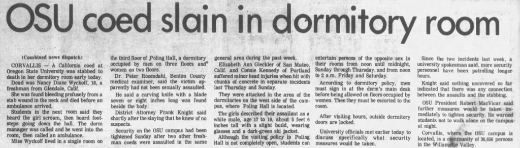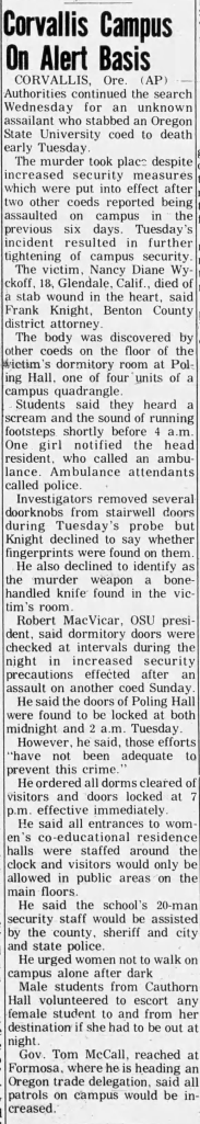As the days ticked by and the month of February came to an end, tensions on OSU’s campus lessened somewhat despite no movement being made on the case. On March 1 a decision was made and pictures of a knife that was identical to the one used to kill Wyckoff as well as the recovered flashlight were published in the OSU newspaper along with a plea that anyone that may know more about either to please come forward. When investigators released the picture of the flashlight they left out that it was found in Nancy’s room, and only stated it had been located ‘somewhere in Poling Hall.‘ LE was able to determine that the knife had been made in Japan and came in a kit along with a fork, and where several stores in Corvallis sold these sets unfortunately they didn’t keep records of their customers.