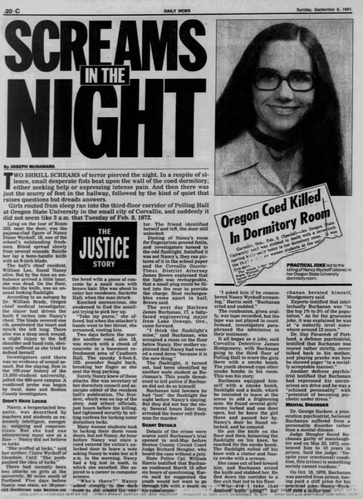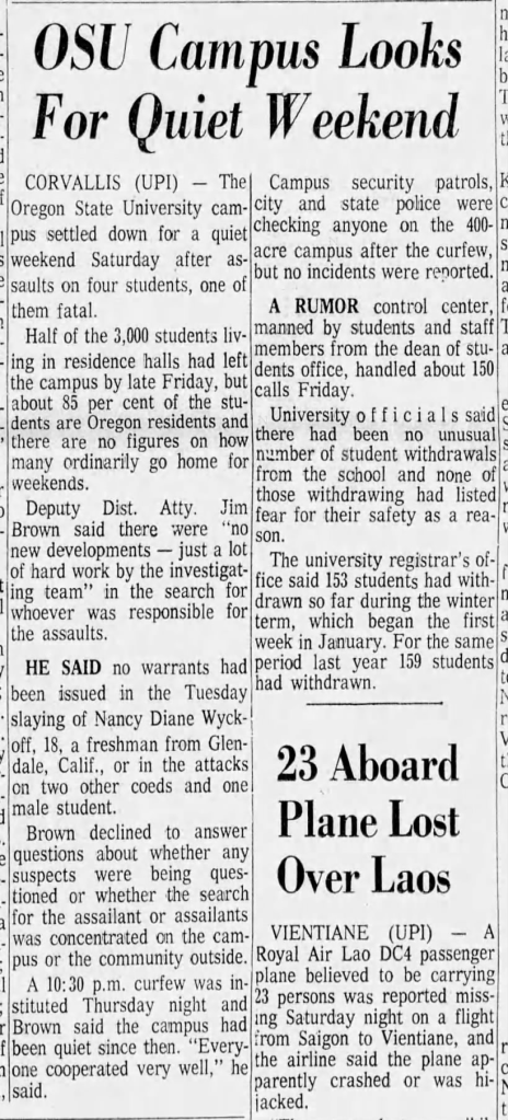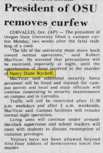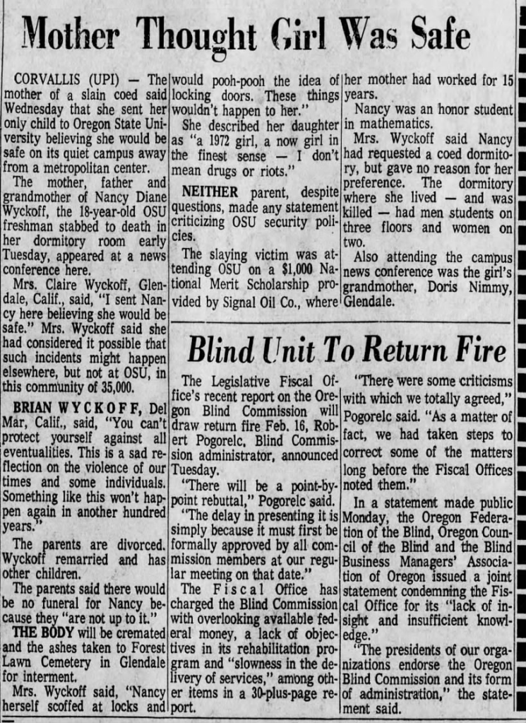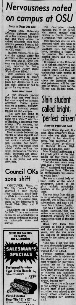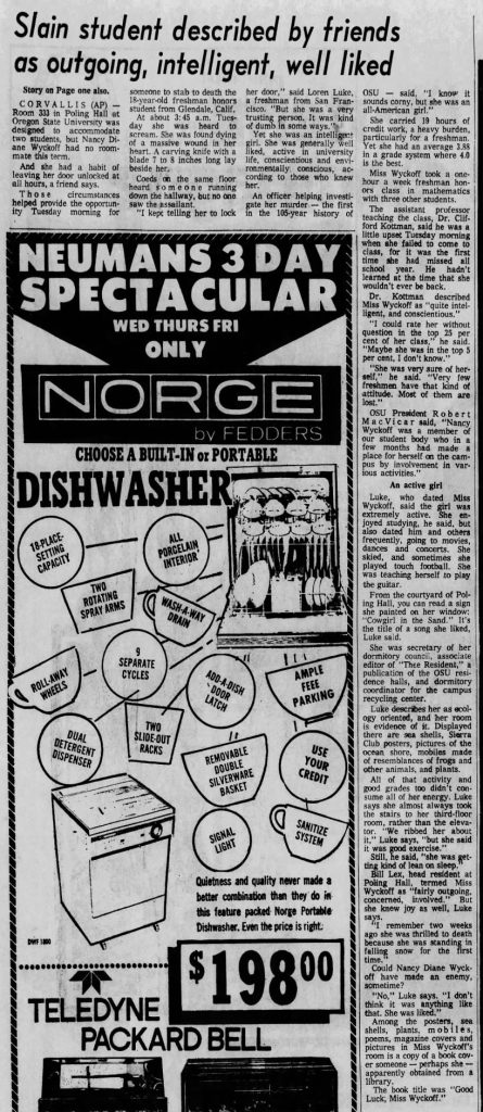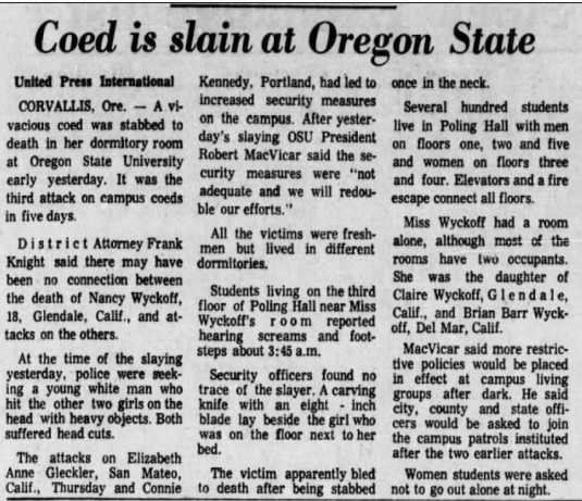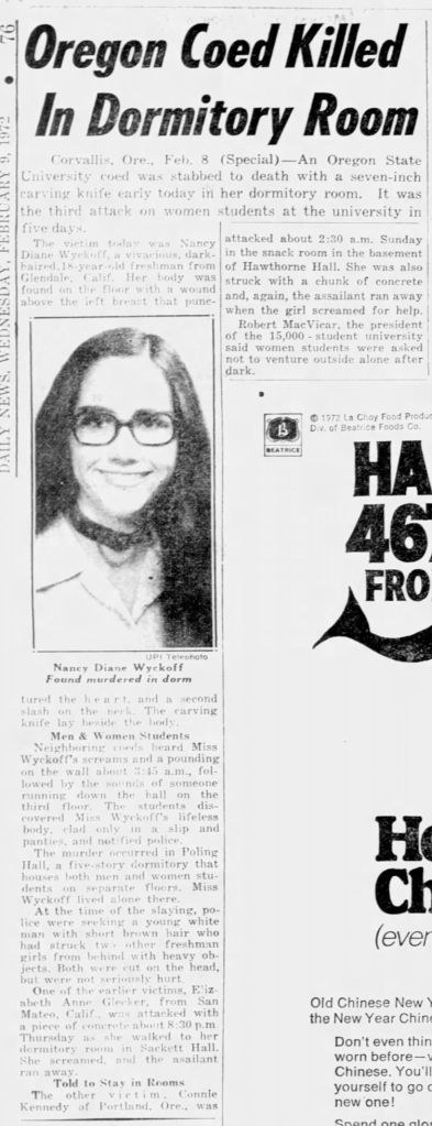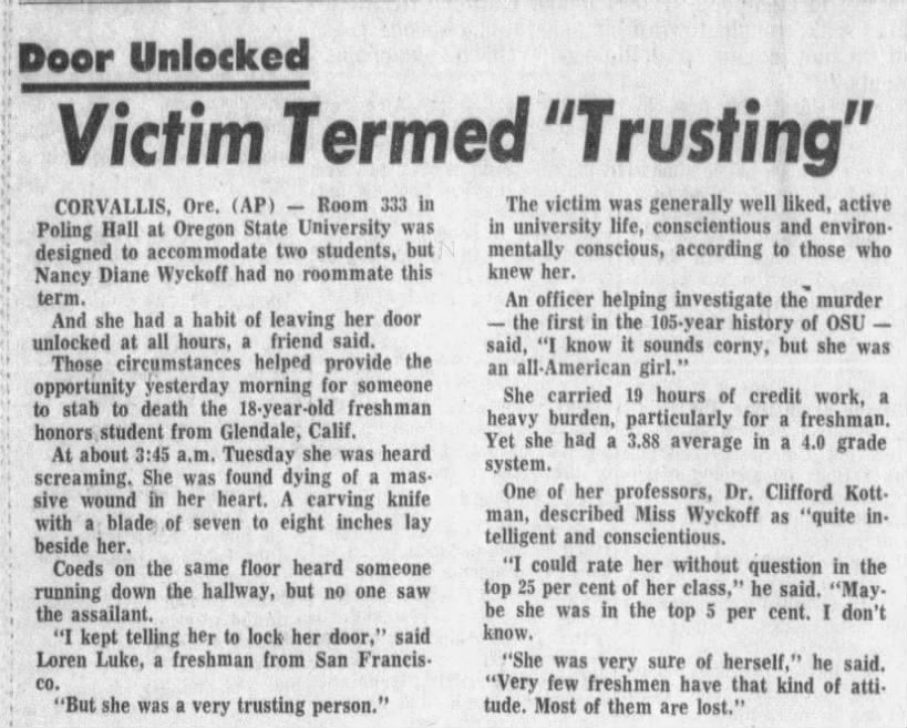 Although she dated around, Nancy had no steady boyfriend at the time of her murder, and according to her mother she: ‘choose to live in a coed dorm because it was the ‘now’ thing to do. Nancy was very much a 1972 girl, in the finest sense.’ Taking an impressive 19 credit hours, Wyckoff was the dormitory coordinator of OCU’s recycling program and was active in the school’s Sierra Club, an organization that cherishes and protects natural beauty. A friend of hers from Herbert Hoover High School that also attended Oregon State said that Nancy was ‘always doing things. She always knew what was going on. But she was a considerate person. She never made you feel stupid just because she was smart.’