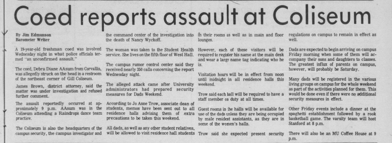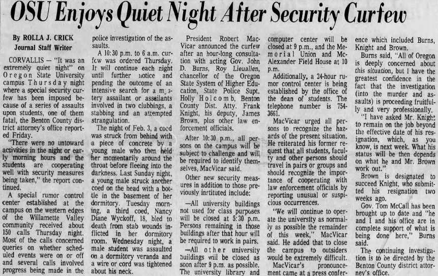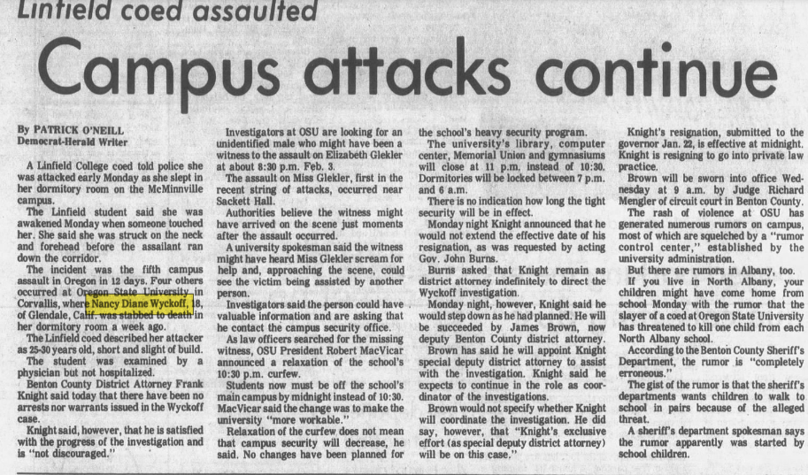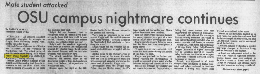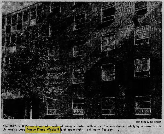 The young ladies quickly called the head resident, a young man named William Lex, who ran to Nancy’s room to assess the situation. He knelt beside her, and although she was gravely injured he could still make out faint, shallow breathing. He then made three separate calls: the first to 911 for emergency care, the second to the Corvallis PD, then finally to the OR State Trooper that was assigned to OSU to help augment the university’s police force.