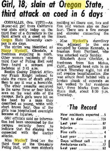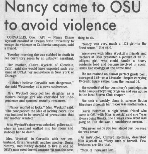 According to her parents, Nancy had an independent streak, and after graduating high school moved to Corvallis, OR where she enrolled at Oregon State University as a mathematics major. She lived in Poling Hall in room 333, and according to an article published in The Olympian, women lived on the first, third, and fourth floors and men lived on the second and fifth floors. Wyckoff was in the honors program, and had received a $1,000 National Merit Scholarship from the Signal Oil Company, where her mother had been employed for 15 years in Glendale. She was interested in politics, nature, and music, and especially loved horseback riding and camping.
