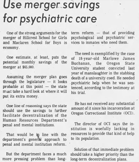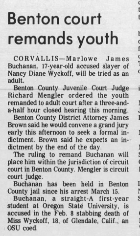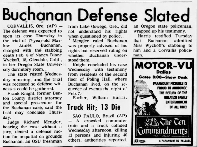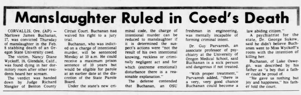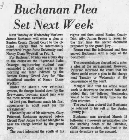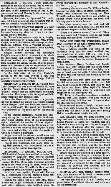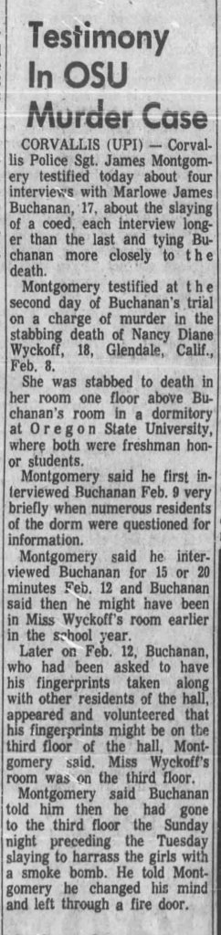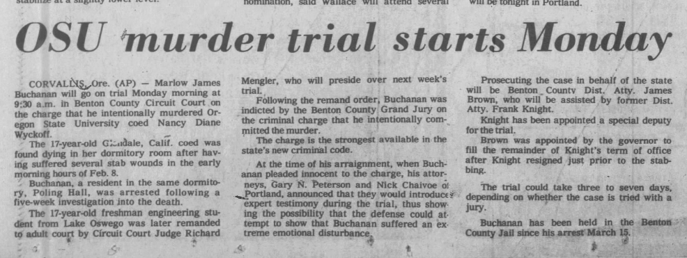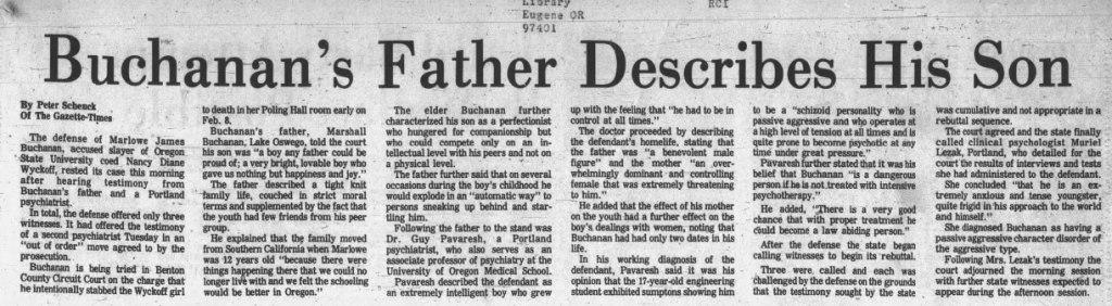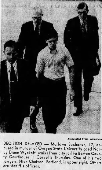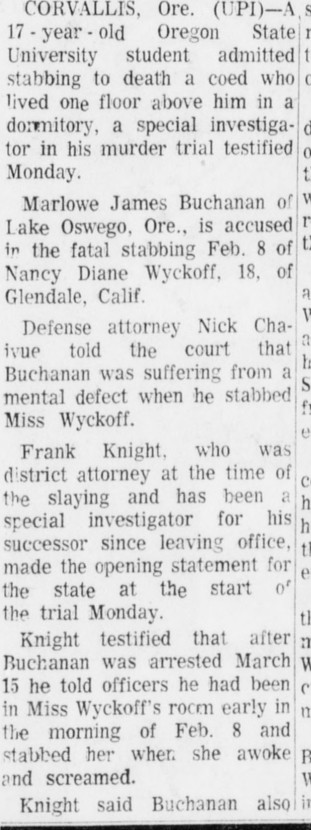 Marlowe waived his right to a jury trial and left his fate up to Circuit Court Judge Richard Mengler. Portland based attorneys Nick Chaivoe and Gary Petersen worked for the defense, and at the beginning of the trial Chaivoe said ‘whatever acts were committed were not done in such a way to enforce free will,’ and that Buchanan was ‘suffering from a mental disease or defect and acted without criminal intent.’ No effort was made by the defense to deny that he killed Wyckoff, but psychiatric testimony was introduced which purported that he was a sick person and would be a danger to society if not properly treated.