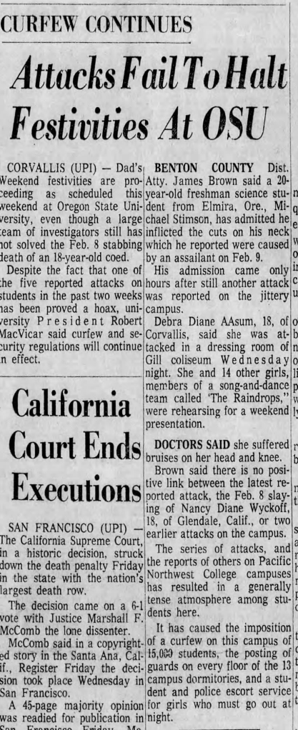 All three policing agencies working the case set up headquarters in the Gill Coliseum on OSU’s campus in order to be close to the investigation, and surprisingly they all seemed to work very well together. Typically LE in the 1970’s didn’t like to share information with each other, and I think of the 1971 murder of Joyce LePage, where the investigation was hindered because the different agencies working the case hoarded information and refused to share it with one another. So much data was collected over the course of Wyckoffs investigation that 1700 pages worth of reports were produced, and the Corvallis Police Sergeant Jim Montgomery (along with his partner, Mel Cofer) alone talked to 199 people during his time working the case.