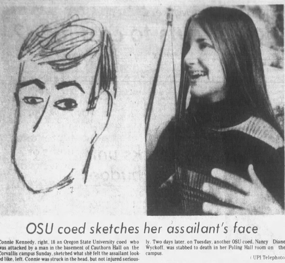 Before Diane’s murder two separate attacks took place on OSU’s campus: at around 8 PM on Thursday, February 3, 1972 a young woman named Elizabeth Ann Gleckler was walking by the Agronomy Building when she got hit in the back of the head with something hard. She fell to the ground and began to scream, which scared off her assailant; she needed stitches and it was eventually determined the weapon her attacker used was a chunk of concrete. Gleckler told campus security that although she didn’t see her assailant’s face she said he was short and young. Just a few days later on February 6, another coed named Connie Kennedy was attacked at around 2:30 AM. She had left her dorm room in Cauthorn Hall and went down to the basement to get a snack from the vending machines, and as she was making her selection felt a blow to the back of her head. A struggle ensued, but thankfully Kennedy was able to get away from her attacker and run away. Like Ms. Gleckler, she didn’t get a good look at her attacker but described him as ‘young, short, brown hair, I think.’