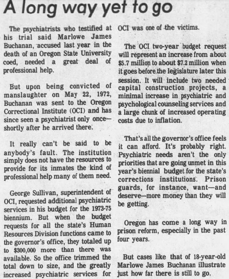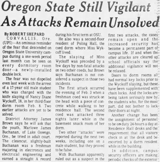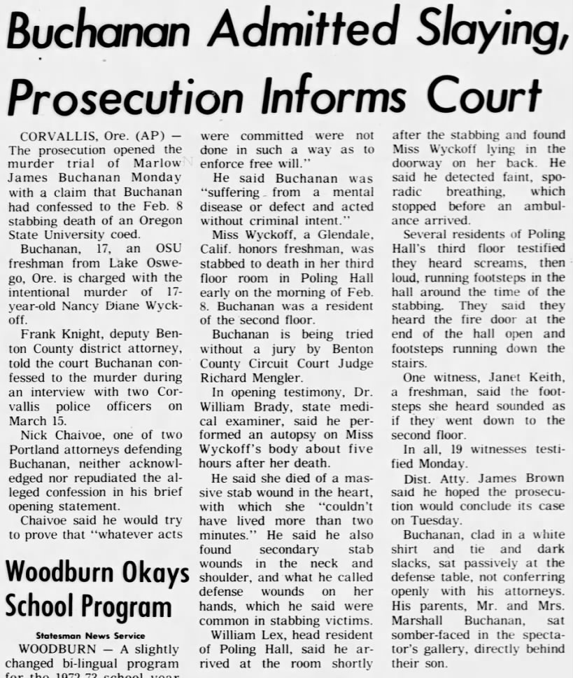 During the trial the defense called psychiatrist Dr. Guy Parvarvesh to the stand, who told the court that said ‘Buchanan thought of himself as a normal kid, when instead, he was very shy, introverted. He grew up with the idea that he was in full control, because he never failed at anything he tried.’ He also said that Marlowe developed a schizoid personality, most likely as a result of growing up with a ‘benevolent father and domineering mother. ‘As a result, this led to him ‘having doubts as to his masculinity, and naturally this developed much anger underneath, that he can never admit to anyone or himself.’ The Doctor also said that the defendant enjoyed playing pranks, which was very normal for a person who is ‘sweet on the outside but has anger underneath that can’t be expressed.’ Pranks were a socially acceptable way to express these feelings, while at the same time he was able to relieve these repressed emotions on an unconscious level.’ Dr. Parvarvesh went on to say that ‘Marlowe is a sick person, if he is not treated he will remain a very dangerous person, but if he undergoes extensive psychotherapy, I feel he can become a normal law abiding citizen.’ On Thursday, May 18, 1972 Buchanan received a 10-year prison sentence for the crime, as it was believed he had not entered the room with criminal intent. He was sent to The Oregon Correctional Institute to serve out his sentence.