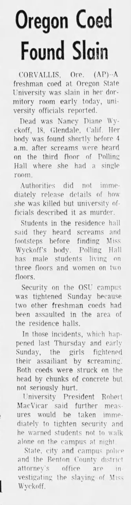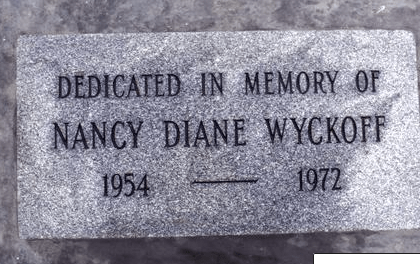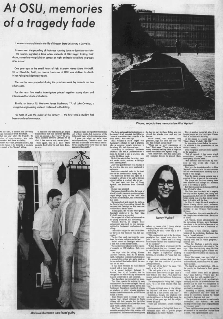 In late February 1972 Nancy’s alma mater of Herbert Hoover High School in Glendale, CA dedicated their journalism room to her memory. In July 1972 students at Oregon State University planted a sequoia tree in her honor in front of Kidder Hall, its plaque reading: ‘Nancy Diane Wyckoff / 1965-1972 / ‘In wilderness is the preservation of the World.’ / -Thoreau.’ Also in the fall of 1972, OSU dedicated their Volleyball Court to Wyckoff’s memory. Brian and Claire Wyckoff established a $1,000 scholarship in their daughter’s honor, and specified that it be divided between a male and female student that were residents of Poling Hall that showed academic excellence along with a financial need. Brian Wyckoff died at the age of 64 on January 10, 1992 and Claire passed at the age of 85 on July 7, 2007. Nancy’s sister Sarah died on April 11, 2023 in San Diego, California.