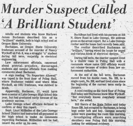 Skilled at chess and bridge, like Nancy Marlowe excelled at math and science, but his social skills and maturity level were not ‘in pace’ with his mind, and he had limited contact with the opposite sex and hadn’t started dating yet. The Buchanan family moved from Southern California to West Oswego, Oregon in 1967 because ‘there were things happening there that we could no longer live with, and we felt the schooling would be better in Oregon.’ He said he had danced with a girl once but that had been the extent of his experience with women, and also suffered from allergies. When asked by a reporter what Marlowe was like, one of his classmates replied with, ‘small thin, slightly built with a baby face and a baby voice.’