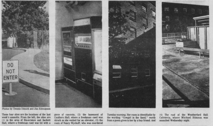 On February 11, 1972 at roughly 8 PM a young student named Michael C. Stinson stumbled into Weatherford Hall, clutching his neck, barely able to speak. Finally, after much effort he was able to say that as he’d been looking at stars on the veranda of the men’s dorm someone had come up from behind him, slipped a cord around his neck and he subsequently blacked out. Stinson was taken to the Student Health Center where he was evaluated, and physicians said that the pressure from the wire or rope is what made the thin red line left behind on his neck. This only clouded the MO of the sneaky assailant even more.