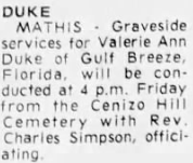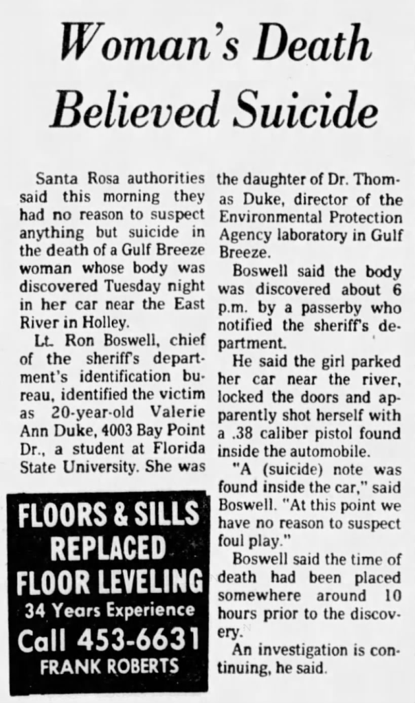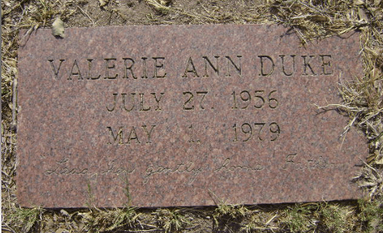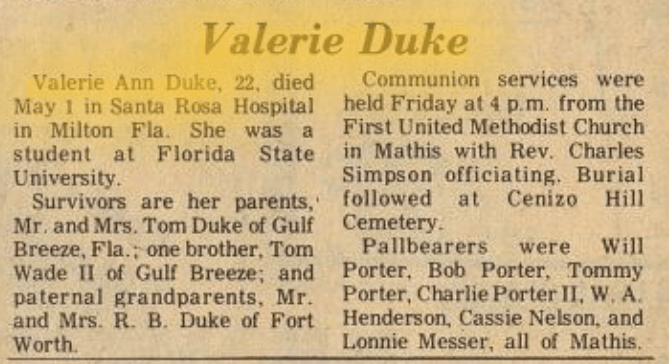 But, Valerie believed it and on May 1, 1979 while driving in between her home in Gulf Breeze and Tallahassee the twenty-two year old* pulled her car off to the side of the road near the East River in Holley and shot herself; she died as a result of her injuries. Her remains were discovered at 6 PM later the day, roughly ten hours after she killed herself . Former Lieutenant Ron Boswell of the Santa Rosa Sheriff’s Department said Duke parked her car near the river, locked the doors, then shot herself with a .38 caliber pistol that was found inside of the car. Also according to Boswell, ‘a suicide note was found inside of the car, at this point we have no reason to suspect foul play.’ It’s strongly speculated by those that knew her well that survivors’ guilt drove Duke to take her own life, and after a communion service she was laid to rest at the Cenizo Hill Cemetery in Mathis, TX. * For the record, I have seen her age listed at both 20 and 22, but simple math puts her at 22 years old.