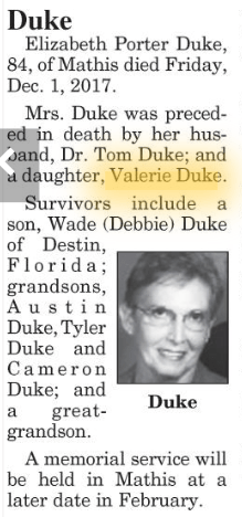 Valerie Ann Duke was born on July 27, 1956 to Thomas and Elizabeth Ann (nee Porter) Duke in Mathis, Texas. Mr. Duke was born on September 15, 1931 Archer City, Archer, TX and Elizabeth was born on August 9, 1933 in Mathis, TX. The couple were wed on November 6, 1954 and had two children together: Valerie and her younger brother Thomas Wade Duke II (b. 1957). An Eagle Scout, Tom went on to earn his PhD in Oceanography at Texas A&M after serving as a Lieutenant in the US Air Force. At some time the family relocated to Tucson, AZ and in 1968 they moved to Gulf Breeze, Florida. The Duke family was Methodist, and before her death Valerie was a member of the Gulf Breeze United Methodist Church.