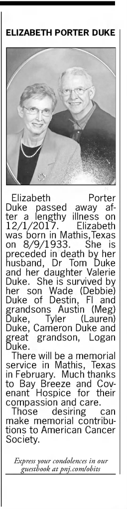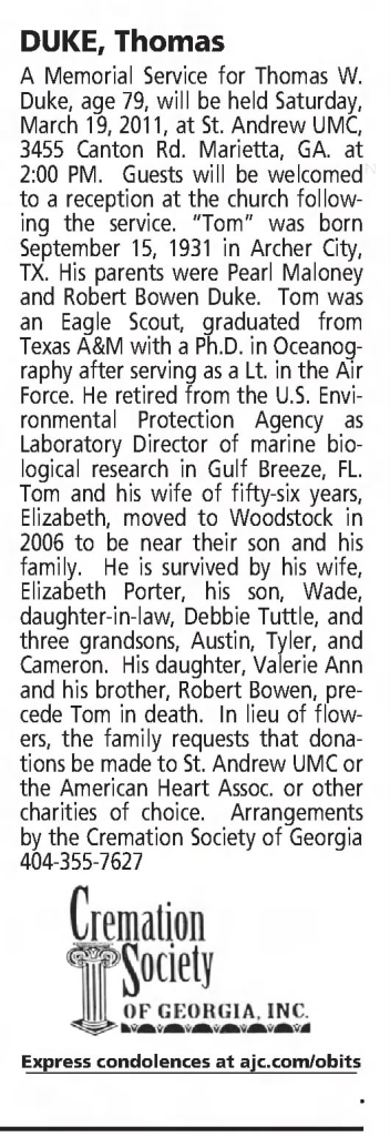 Thomas Wade Duke I retired from the US Environmental Protection Agency as their Laboratory Director of Marine Biological Research in Gulf Breeze, FL, and went on to work as an environmental consultant for five years. In 2006 Tom and Elizabeth moved from Florida to Woodstock, Georgia to be close to their son and his family. Dr. Thomas Duke died at the age of 79 on March 10, 2011 in Woodstock, Georgia, and Mrs. Duke passed away at the age of 84 after a lengthy illness on December 1, 2017 in Pensacola.