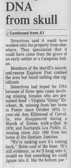 The day he got out of prison, Linn County Detectives questioned Erickson about Virginia’s disappearance on the first of several occasions, and just like he did with his children, he changed his story multiple times, and none of his reasoning fully explained what may have happened to her or where her body could be. On one occasion, he said his wife changed her mind about going hunting because she had a headache and he went without her, and she was gone when he returned. Another time, he claimed they had left the house together but after only making it one block away Virginia asked to go to a store to buy candy, and while inside she used the pay phone to call her boyfriend, then walked back to the house to meet him. A third story involves Ginny leaving him and their family to be with a truck driver from Madras, OR. Erickson also volunteered that he’d seen her a few months after her disappearance and she was ‘fine,’ a sighting that has never been confirmed by investigators.