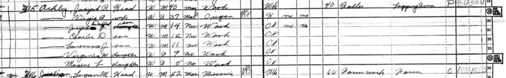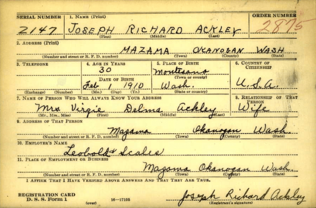 Virginia Mae Erickson was born on April 26, 1941 to Joseph and Virgie (nee Lee) in Mazama, WA. Mr. Ackley was born on February 1, 1910 in Montesano, and Virgie was born on a houseboat on June 12, 1912 in Empire, OR. The couple were wed on March 18, 1928 in Buxton, Oregon and had eight children together: Virginia, Lawrence, Maxine, Joseph, Charles, Jean, David, and a daughter named Joyce that died in childbirth.