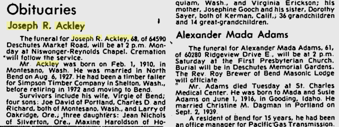 Virginia’s father Joseph Ackley died on February 15, 1978 in Bend, and Virgie passed away at the age of 76 on February 9, 1989 in Hoquiam, WA. Her brother Charles died on September 9, 1993 in Montesano, WA, and her other brother Richard died on March 10, 2008 at the age of 80 in Casa Grande, AZ. Her twin daughters Tammy and Denise have both passed away as well after struggling with substance abuse.