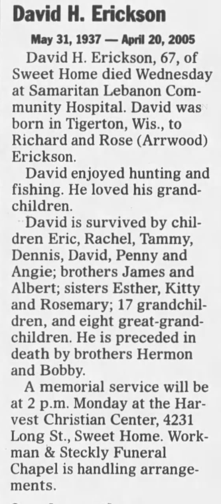 In the years before his death Denise hounded her father, asking him over and over again what happened to her mother and what he did to her, and on one occasion after telling him that she thought he was responsible for her disappearance he responded, ‘well, I don’t know what to say about that.’ David Erickson died of congestive heart failure and lung cancer at the age of 67 in Lebanon, OR on April 20, 2005, taking all of his secrets to the grave. According to his obituary, he had one more child named Angie and he loved hunting and fishing. The brief write-up also mentioned that he ‘loves his grandchildren,’ and knowing what we do know now about this disgusting creature, it just makes me sick. In 2005 when David died members of the Erickson family were so thankful that they went to his funeral just to make sure he was really gone, an event they were kicked out of. According to Rachel, there’s a few people out there that she feels may know what happened to her mother but refuse to come forward and talk.