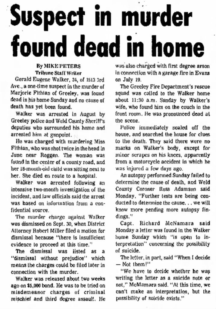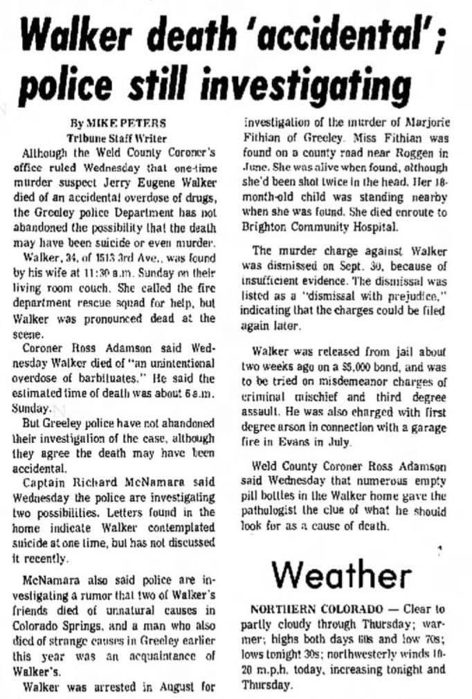 Two weeks after his release, Walker died of an accidental drug overdose while sitting at home in a living room couch: Weld County Coroner Ross Adamson said that Walker died of an ‘unintentional overdose of barbiturates,’ and put his estimated time of death at around 6 AM on Sunday, October 12, 1975. When police and paramedics arrived on the scene they found ‘lots’ of empty pill bottles, and the coroner ultimately ruled the death as an accidental overdose. A Captain with the Greeley PD told the local newspaper that letters found in Walkers house brought up suicide, however according to those that knew him he hadn’t brought it up recently. Captain Richard McNamara of the Greeley PD said that investigators were also looking into a rumor that two of the deceased friends had recently died of unnatural causes in Colorado Springs, and another had passed in Greeley earlier in the year but nothing ever came of it. According to Ashley Flowers, some informants told police that Walkers death wasn’t accidental and was actually ‘tied to Marjorie’s death.’