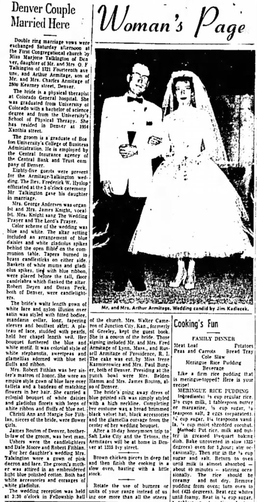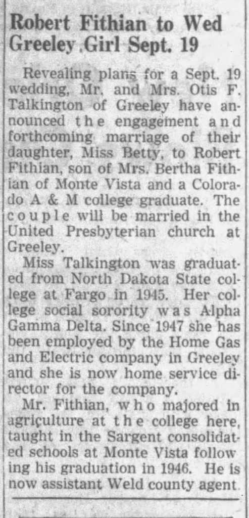 Background: Marjorie ‘Margie’ Sue Fithian was born on June 4, 1952 to Robert and Elizabeth ‘Betty’ (nee Talkington) Fithian in Greeley, Colorado. Robert Warren Fithian was born on November 23, 1920 in Bayard, Nebraska and after graduating from high school he joined the Army and served in WWII; when he returned home from the war he enrolled at Colorado State College of Agriculture and Mechanic Arts and graduated in 1946. He was employed as an ‘Assistant County Agent.’ Elizabeth May Talkington was born on May 4, 1923 in Belfield, ND, and according to her Ancestry page, after graduating from Fryberg High School in 1941 she attended North Dakota State University in Fargo, where she earned a BS with a focus in Home Economics in 1945; she went on to get a job as a home service director at a gas and electric company. The couple were married on September 19, 1948 and had four children together: Christine (b. 1949), Virginia (b. 1957), David (b. 1960), and Marjorie. They divorced on June 3, 1970 and Mr. Fithian got remarried to a woman named Erma on July 15, 1977 in Reno, NV. After separating from Robert, Betty went back to school at UNC and earned her education degree, and began her career at a local HeadStart Program; she later taught elementary school in district six in Greeley (primarily focusing on Kindergarten).