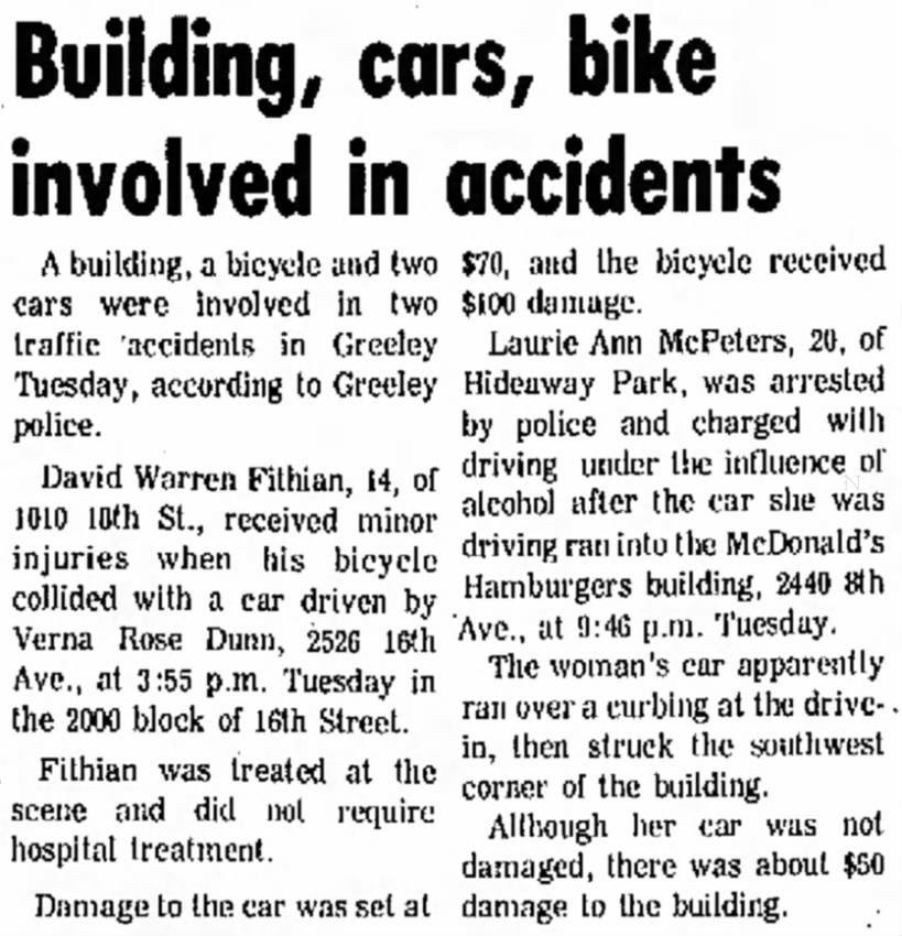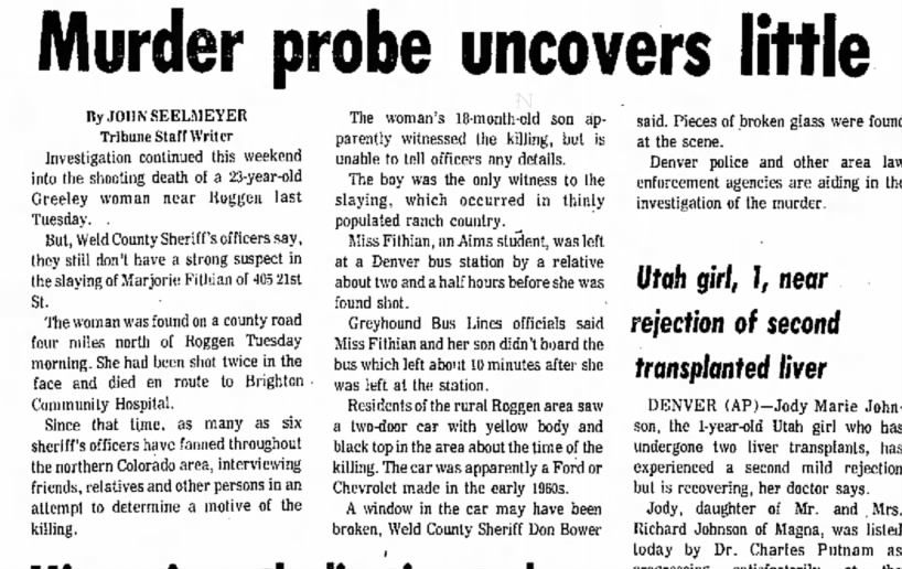 On June 26th news of Fithian’s murder hit the local newspaper, and in addition to publishing her obituary The Greeley Daily Tribune also announced the establishment of a memorial fund for Sage. A handful of locals contacted police and reported that they had seen mother and son at a nearby cafe eating breakfast earlier in the morning before she was killed; another tip claimed that several men had witnessed someone picking them up from the parking lot of ‘The Picadilly Restaurant’ in Denver. In the weeks following the murder detectives across multiple police jurisdictions in Colorado investigated hundreds of Fithians friends/family/acquaintances/and classmates, but didn’t learn much useful information.