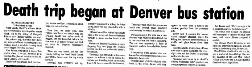 June 1975: On Friday, June 20, 1975 Marjorie and Sage, along with a single suitcase, made their way to the bus station in Greeley; the twenty-three-year-old single mom had a fun, family-oriented weekend in Denver planned with her aunt and uncle and had intentions of returning early Monday morning. Mother and son arrived safely at their destination and enjoyed some quality time with family, and when their visit was over at around 7 AM on Sunday, June 23rd*, her uncle dropped them at a bus station in Denver to return home on a bus that departed at 7:30 AM (one report specifically says they parted ways at 7:20 AM); the two never boarded. The Greyhound bus driver was later tracked down and interviewed by detectives, and he said that Marjorie and Sage had not been on his bus that morning. *I did see it incorrectly reported that Fithian was dropped off at the bus stop on June 23 but wasn’t found until the 24th, but that doesn’t seem to be accurate, as they went for a weekend and the 24th was a Tuesday (and every other report says that she was found later the same morning).