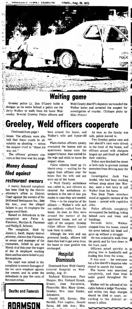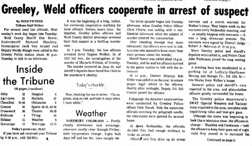 An Arrest: Just a little over two months after Fithian was murdered an arrest was finally made: on August 27, 1975 the Weld County Sheriff’s Department arrested thirty-four year old Jerry Eugene Walker on first degree murder charges based on information provided to the office from a CI. According to Greeley Police Officer Chris Clinton, a local confidential informant reached out to him and shared that Walker told him that he ‘shot the bitch in the face,’ and bragged about killing the young mother; he had also shown him one black and white photo and two color ones of a wounded Marjorie that had ‘gunshot sounds to her face’ and was ‘suffering from wounds.’ After he was taken into custody detectives went to his house armed with a search warrant with hopes of finding the murder weapon, ammo, or any photos of Fithian; they didn’t find anything.