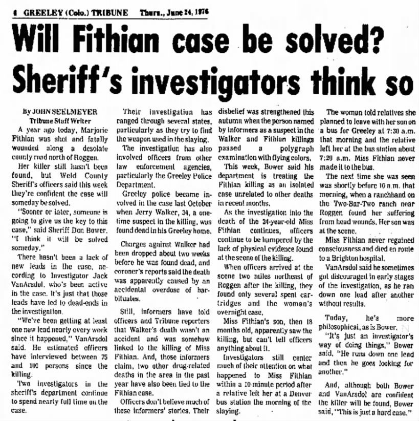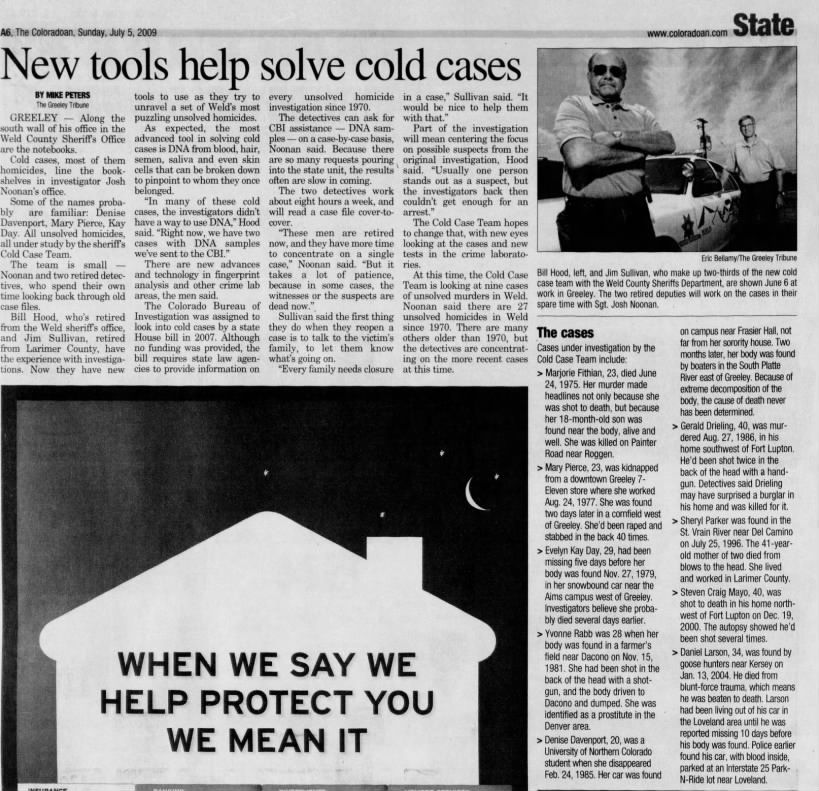 Recent Years: In the early 2000’s Fithian’s case was reopened, and detectives hoped that a fresh set of eyes on the investigation (as well as modern day forensic techniques) would help them, however that wasn’t exactly what happened. According to Sheriff Reams, who was a detective at the time, ‘in 1975 in Weld County the resources just probably were not as available to work a case like this. And the manpower that would have been necessary to track down those leads and find people in Denver and various other areas and it seems simple now, I wish we could go back and try again. And every year that goes by you realize it’s just that much farther from probably having that likelihood. I worry about all that stuff, and to be honest with you when I went back and looked for this case file I was able to find a certain amount of information that was stored on-site. And then once I got back from the FBI Academy I went out to a place where we used to store archives and I found another box of documents or evidence related to this case: photo and what not that were in a place where those items should have never been. And so, yeah I worry about what steps were done and not properly documented or not or were properly retained. I hate the idea of potentially saying, ‘hey, basics steps weren’t taken, and if they were they certainly weren’t done in a way that was documented that we would have expected by today’s standards.’’