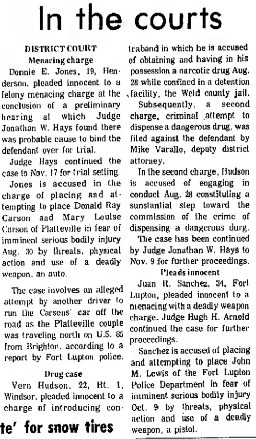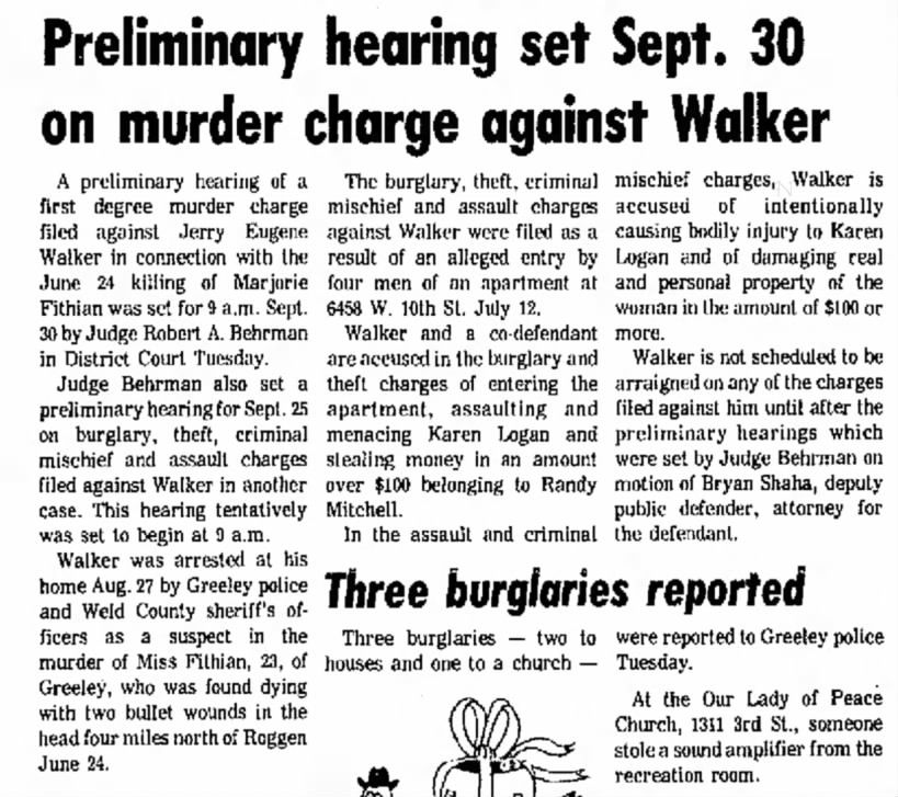 Walker told investigators that he picked up Fithian and her son from the Denver bus station because she was supposed to be transporting drugs for him, but when she failed to produce the substances or money he killed her. On September 30, 1975 the murder charge against him was dismissed due to a ‘lack of evidence,’ however because he was being still being charged with the misdemeanor crimes of arson, criminal mischief, and assault he was released on $5,000 bond; the charges were ‘dismissed without prejudice’ indicating that they could be refiled again in the future if sufficient evidence was found. According to The Greeley Daily Tribune, Walker and a co-defendant were accused of the burglary and theft charges of entering the apartment, assaulting, and menacing Karen Logan and stealing money in an amount over $100 belonging to Randy Mitchell. Additionally, he is charged with causing intentional bodily harm to that of Ms. Logan and of damaging real and personal property of the woman in the amount of $100 or more.