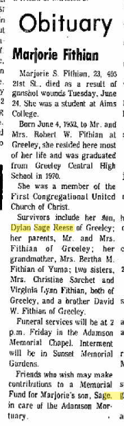 A petite woman, Margie stood at a mere 5’0” tall and weighed only 108 pounds; she had auburn hair, green eyes, andwas described as a ‘free spirit’ and a ‘hippie chick’ by her loved ones. She was very trusting almost to a fault and no one could think of any reason why anyone would ever want to hurt her. At the time of her death in June 1975 she was enrolled at Aims Community College in Greeley, and according to the local newspaper she was employed there as well. At some point after graduating from high school Fithian married Vietnam War veteran James Patrick Reese, who was born on June 24, 1945, but the couple divorced on April 5, 1971. After separating from her husband she moved into a trailer in her hometown of Greeley with her 18-month-old son, Dylan Sage (who eventually dropped Dylan from his name), and where no source ever came right out and said that her ex-husband was his father some articles gave the child the last name of ‘Reese;’ Sage’s Dad wasn’t ‘in the picture,’ and lived outside of Colorado.