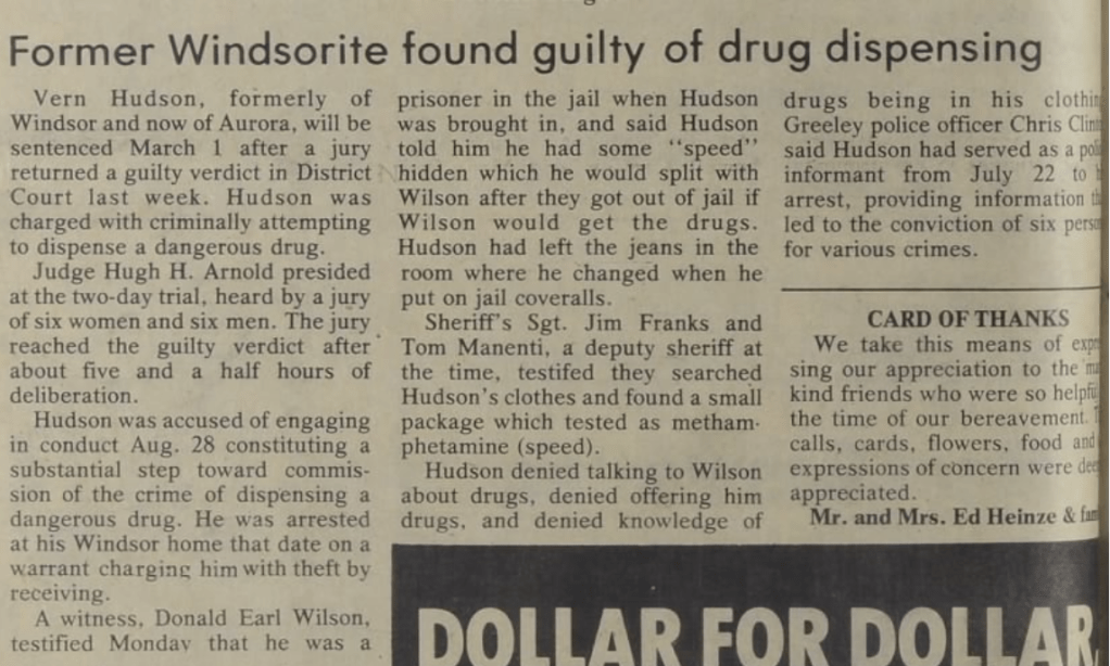 After Jerry died Fithian’s case completely stalled and a year went by with little movement: Weld County didn’t have concrete evidence that linked Walker or Vern Hudson to the murder, and the men kept changing their stories and going back and forth on what happened. In early 1977 the Sheriff’s Department brought Larry Hernandez in for a lie detector test, and before talking with detectives, he allowed himself to be administered sodium pentothal (or truth serum). During the interview he told them that he had made the entire story up about Marjorie’s murder and knew nothing about her death, but he did admit that he sold her weed a few times and the two had gone to the local community college together.