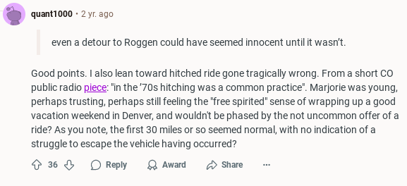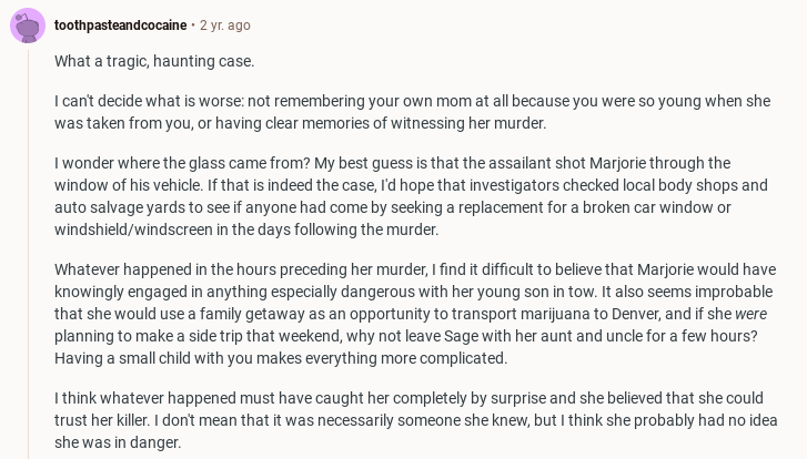 ‘TaraCalicosBike’ on Reddit, post titled: ‘In June of 1975, twenty three year old Marjorie Fithian was found dead on a desolate gravel road in Colorado. She had gunshot wound to her face, and her 18 month old son was sitting beside her, holding her hand. Who killed Marjorie?’ in the hub, ‘UnsolvedMysteries.’