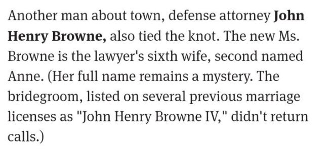 A blurb from an article published in the Seattle Times on January 3, 2003 that mentions John Henry Browne’s sixth marriage.