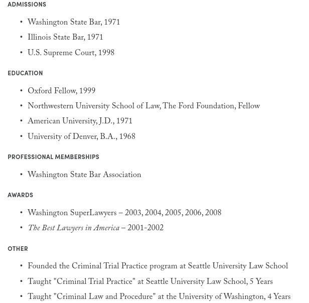 Accolades: Browne stands at an impressive 6’7″ tall, and has brown eyes; (in his youth) he thick brown hair, and when he let it grow long and had he occasionally would be mistaken for Yanni, the New Age musician (his ‘thick black mustache’ didn’t help). In 1968 John relocated to Washington DC to attended American University’s School of Law, and upon graduating in 1971 he got a Fellowship at Northwestern University’s School of Law; he was also an Oxford Fellow in 1999. From 1971 to his retirement in 2025 he tried over 250 criminal cases and was a member of the Washington State Bar Association; he was also voted one of Washington state’s ‘Super Lawyers on multiple occasions (from 2003-2006 then again in 2008) and had the distinction of being one of ‘The Best Lawyers in American from 2001 to 2002.’ JHB also established the Criminal Trial Practice program at Seattle University’s Law School and taught ‘Criminal Trial Practice’ at the school for five years; he also taught Criminal Law and Procedure’ for four years at the University of Washington.