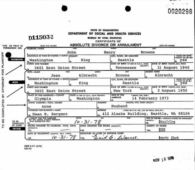 John Henry Browne and Jean Albrecht’s Record of Divorce that was filed on November 15, 1979.