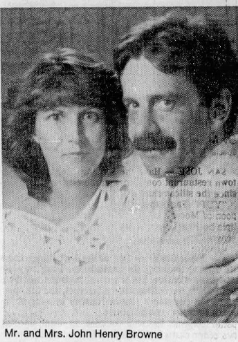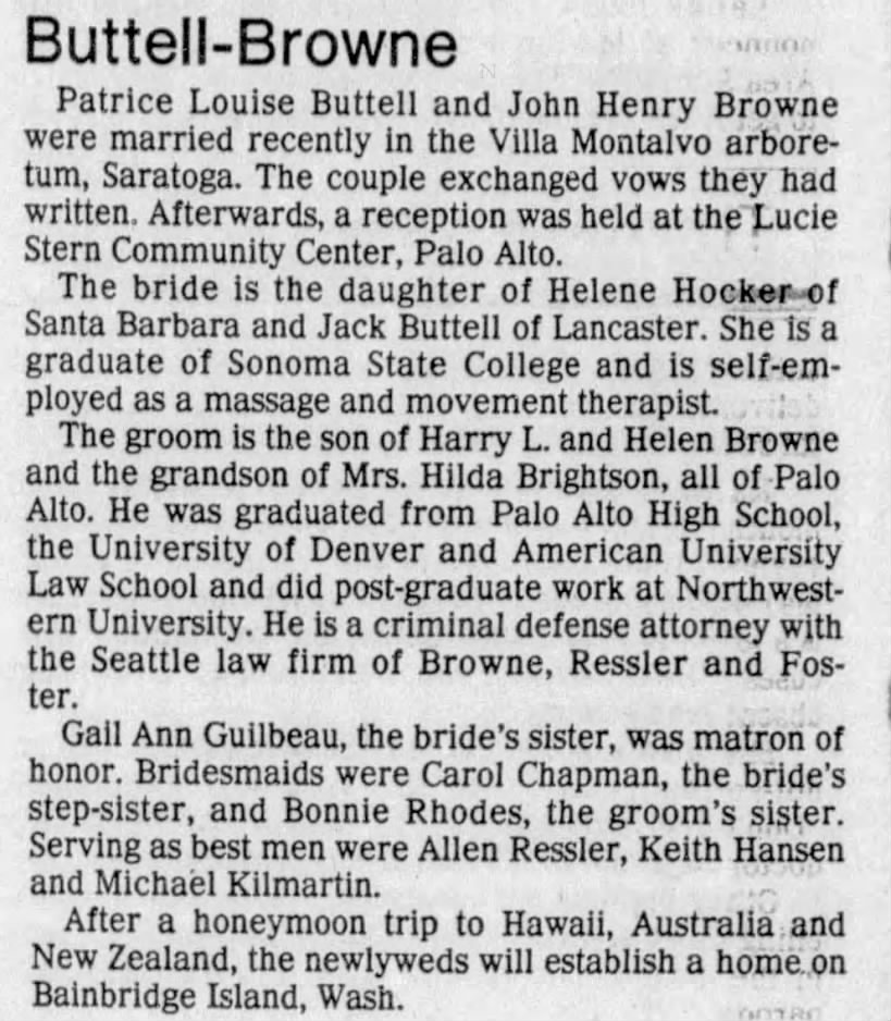 A newspaper clipping announcing the union of John Henry Browne and his third wife, Patrice Louise Buttell that was published in The Peninsula Times Tribune on July 4, 1984.