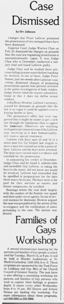 A newspaper article about charges against JHB client Peter LeGrow being dismissed that was published in The Seattle Gay News on March 3, 1978.