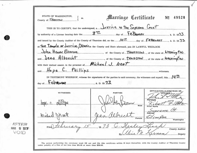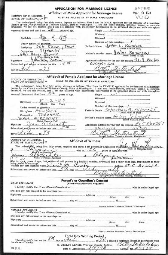John Browne and Jean Albrecht’s Marriage Application from February 1973 filed in Thurston County, WA.