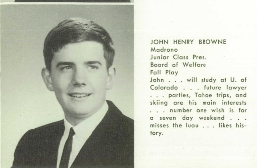 John Henry Browne’s senior year picture from the 1964 Palo Alto High School yearbook.
