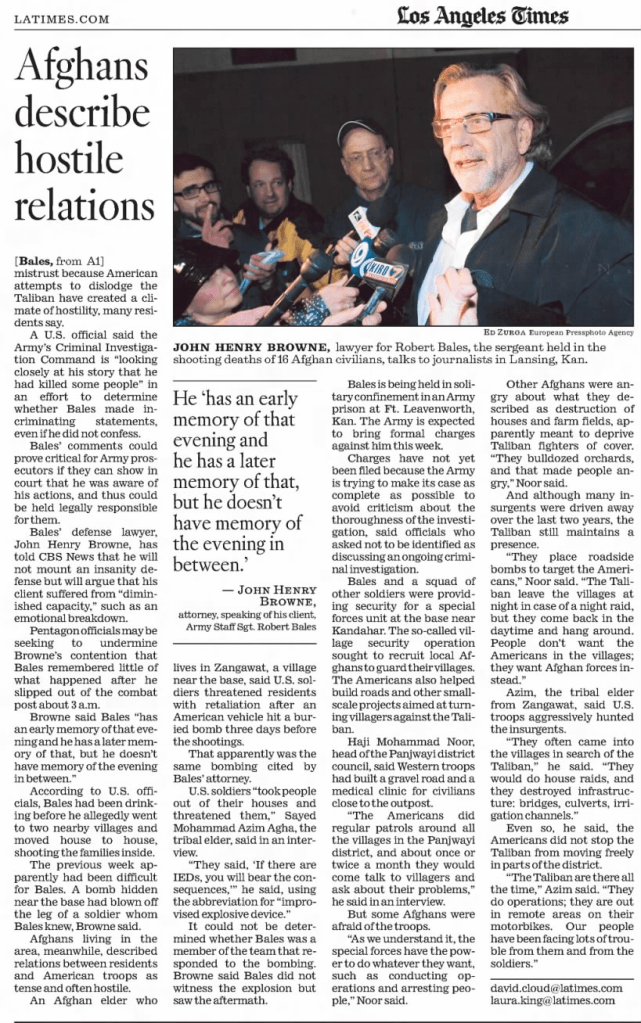 An article about Robert Bales that mentions John Henry Browne that was published in The Tulare Advance-Register on March 17, 2012.