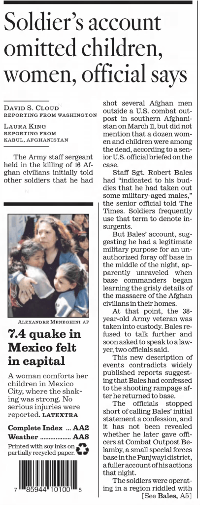 United States Army Staff Sergeant Robert Bales. The soldier was sent to Afghanistan in December 2011, where he served with the 2nd Battalion, 3rd Infantry Regiment of the 3rd Stryker Brigade Combat Team before he was assigned to a village stability operation close to where the massacre took place.