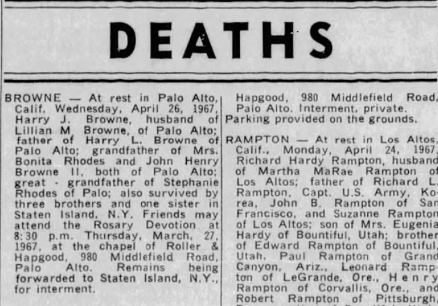John Henry Browne’s grandfather’s obituary that mentions his name published in The Peninsula Times Tribune on April 27, 1967.