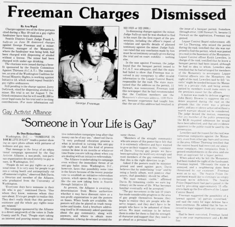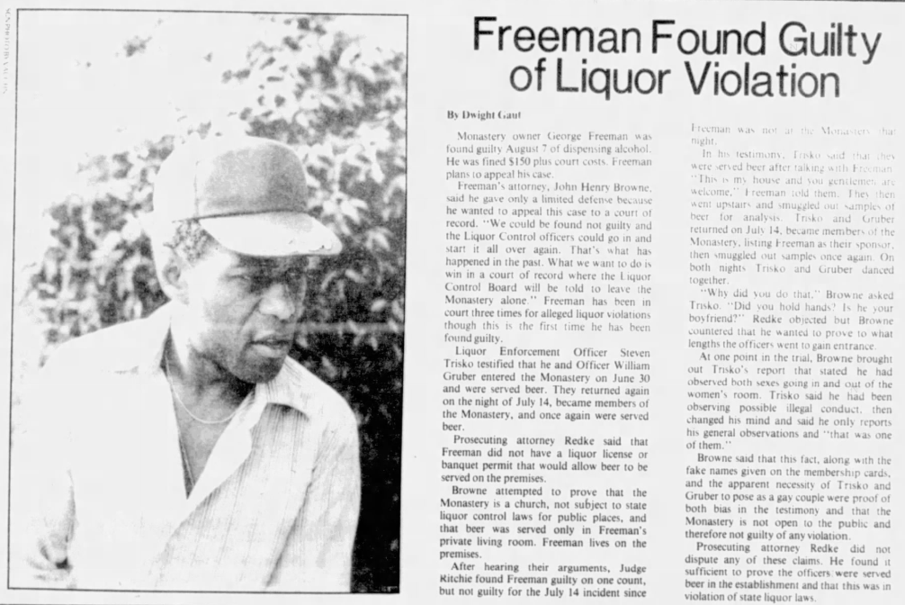 George Freemanfrom 1977 to 1985 Minister George Freeman operated ‘The Monastery,’ an organization in Seattle that simultaneously acted as a gay church, a nightclub, an LGBTQ community center, and a homeless shelter for queer youth all wrapped up in one. For example: on a typical day, Freeman would host DJ’s playing dance music in the early evening, then at 2 AM would stop everything to deliver a sermon. In April 1978 he got busted serving alcohol without a license to an undercover officer, who paid $7 for what the establishment called ‘a tithe’ (they also said he didn’t have the appropriate banquet permit either). During the proceedings, it was noted that The Monastery was registered as a religious organization with the Universal Life Church, and the prosecutor argued that the activities occurring at the Monastery were not religious in nature. For these charges, Freeman was represented by John H. Browne, and in the end the Seattle courts fined him $150.
